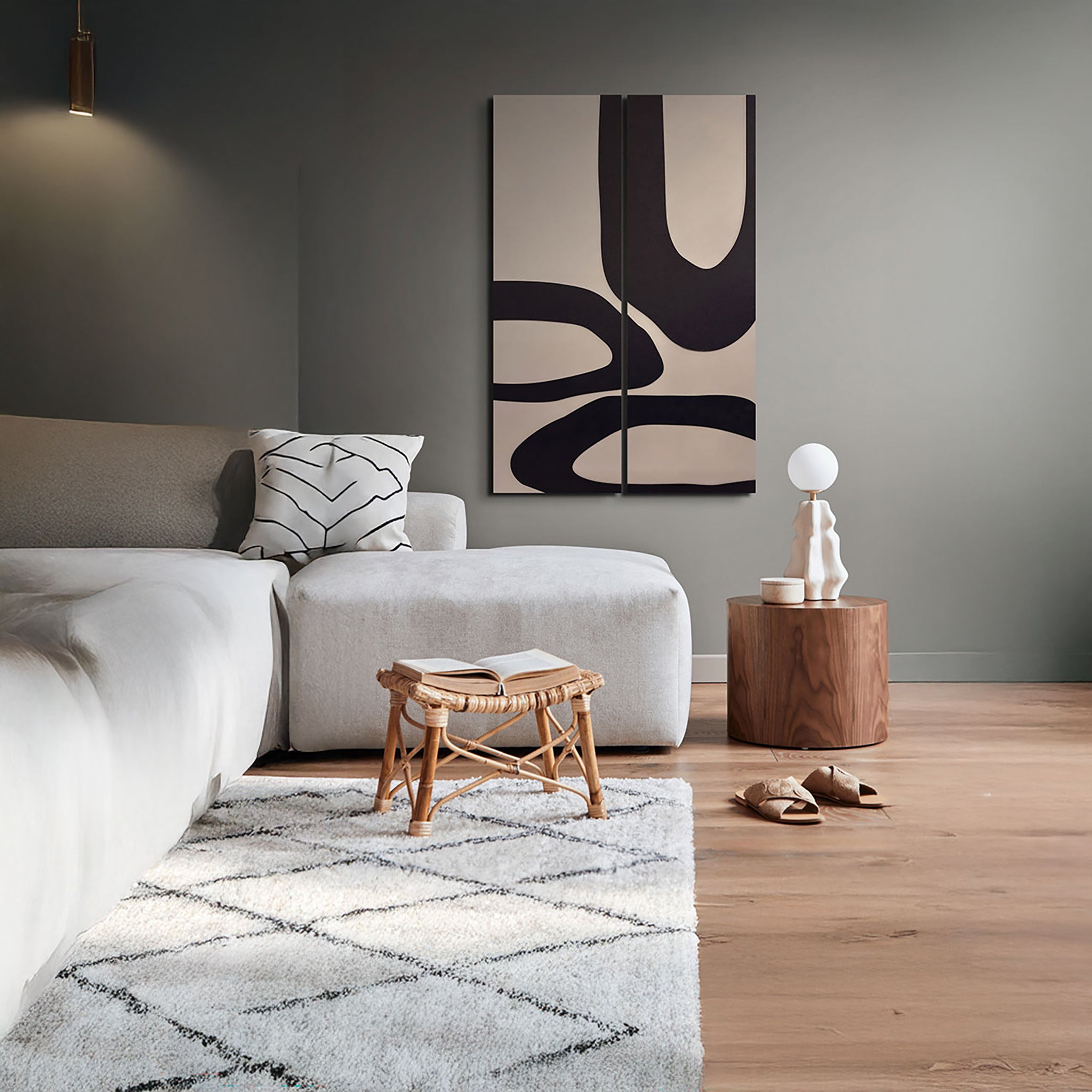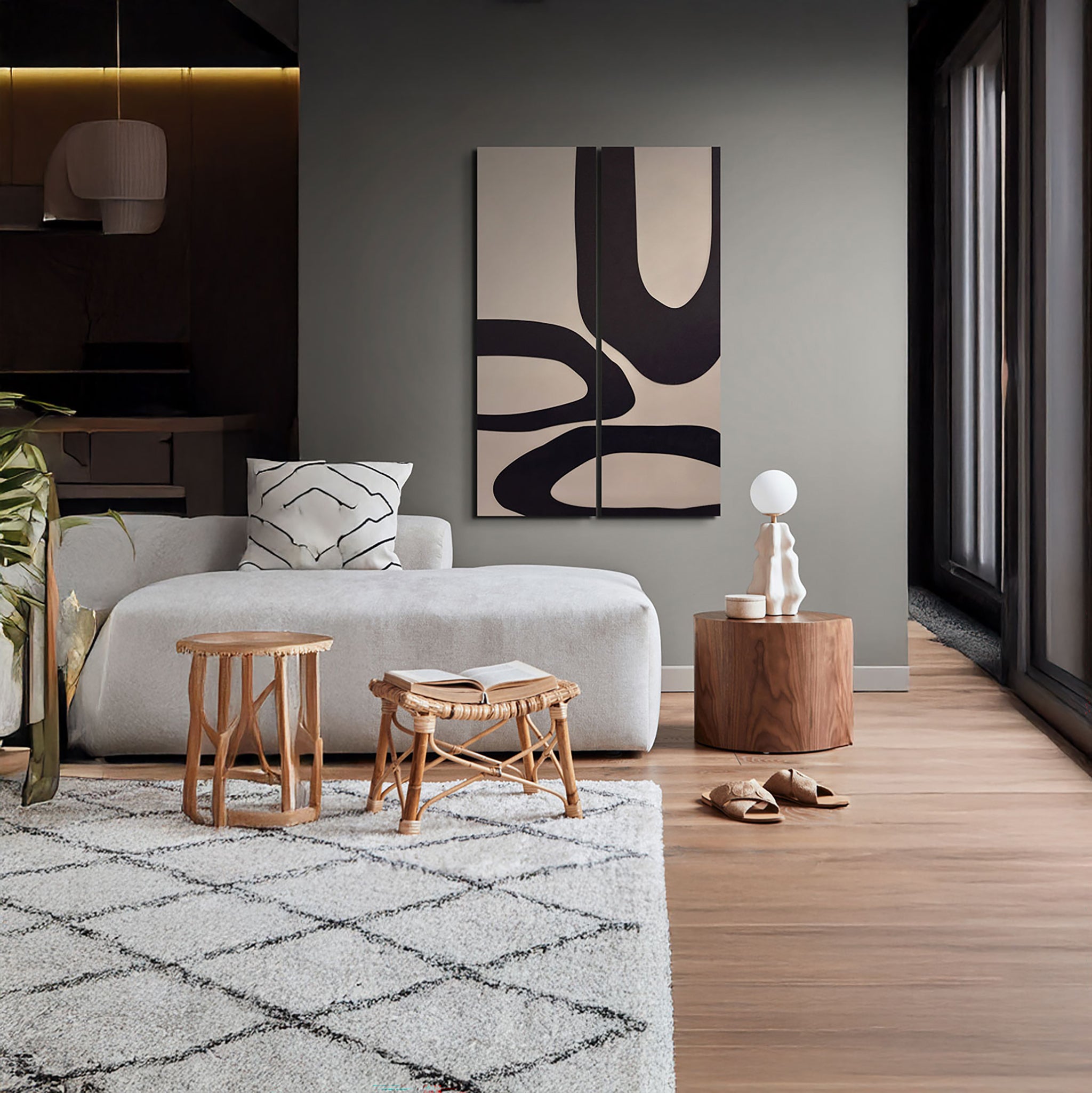 Echo Forms explores the rhythm of repetition and balance through sweeping organic shapes that flow seamlessly across two panels. The interplay of bold black contours against a soft neutral background creates a visual dialogue — fluid yet structured, dynamic yet serene.