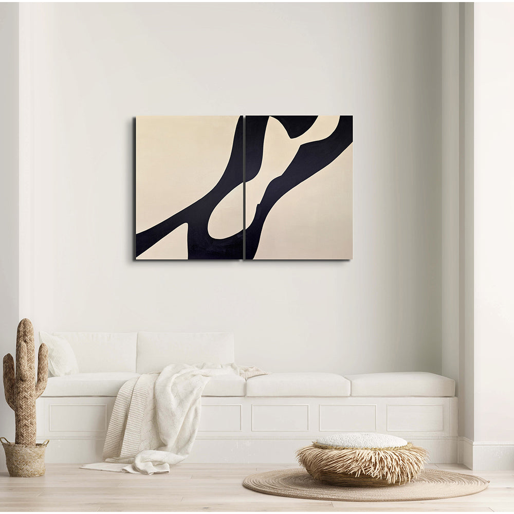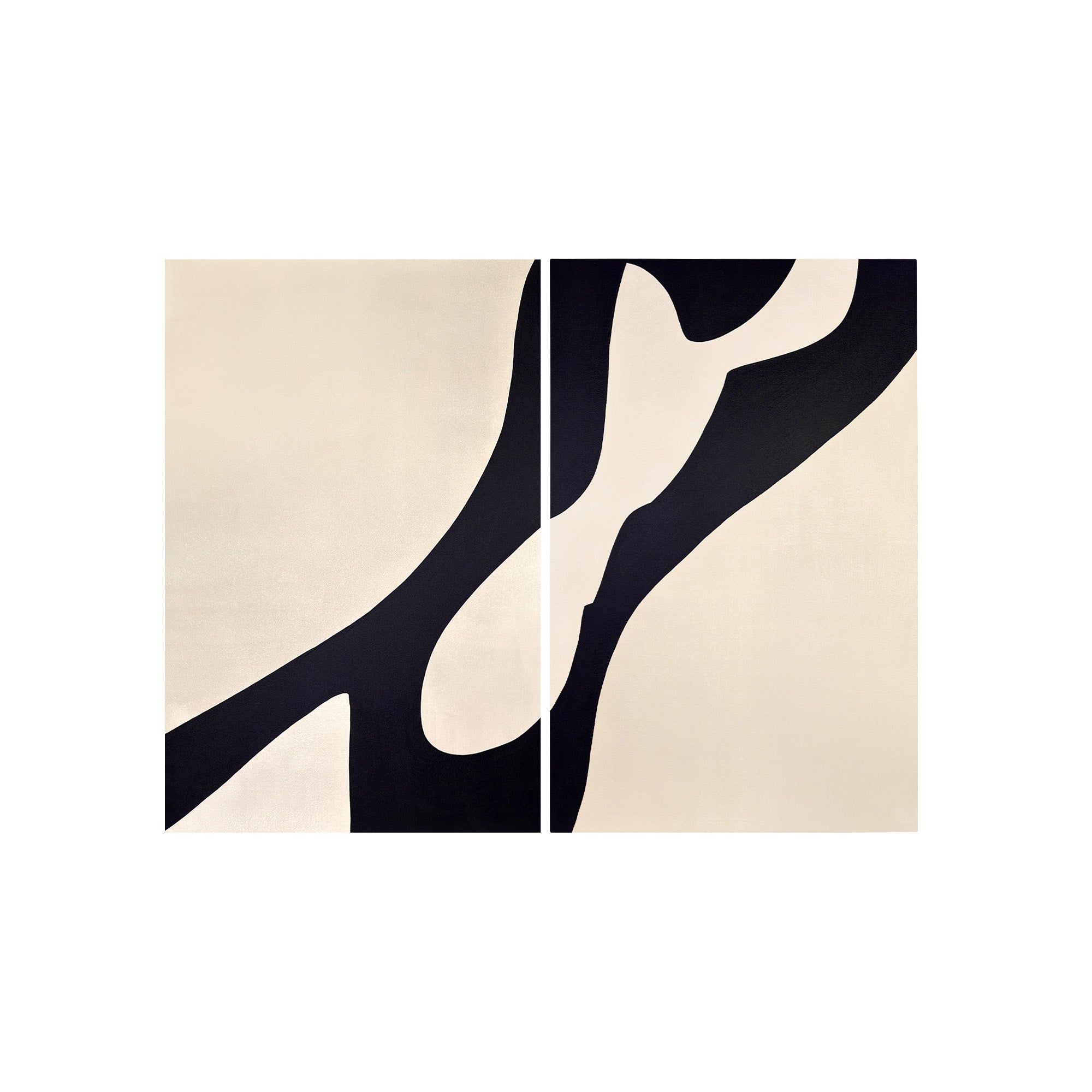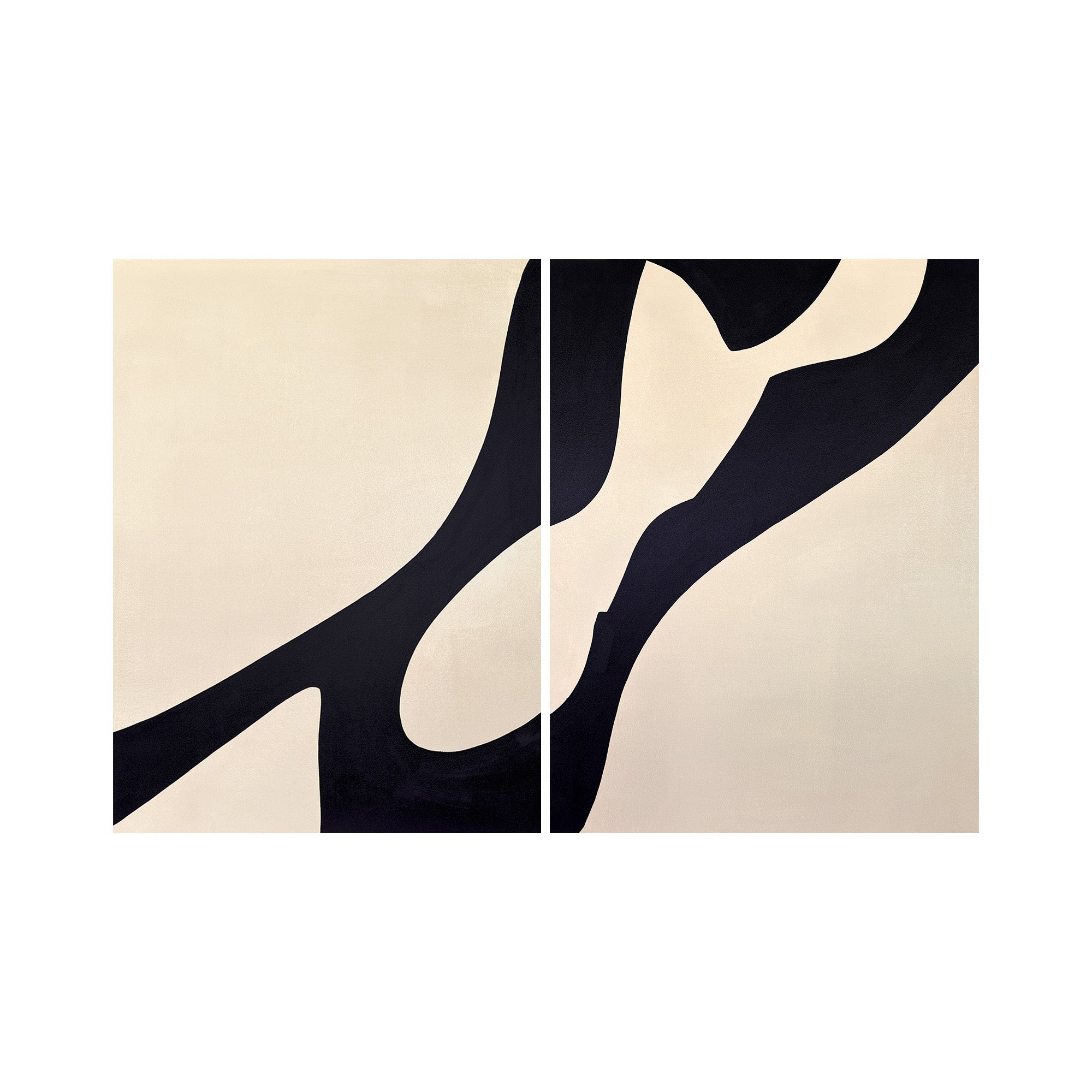 A hand-painted diptych of sweeping black forms flowing across soft light backgrounds. The two panels echo one another in movement and contrast, capturing harmony through fluid lines and balanced space.
