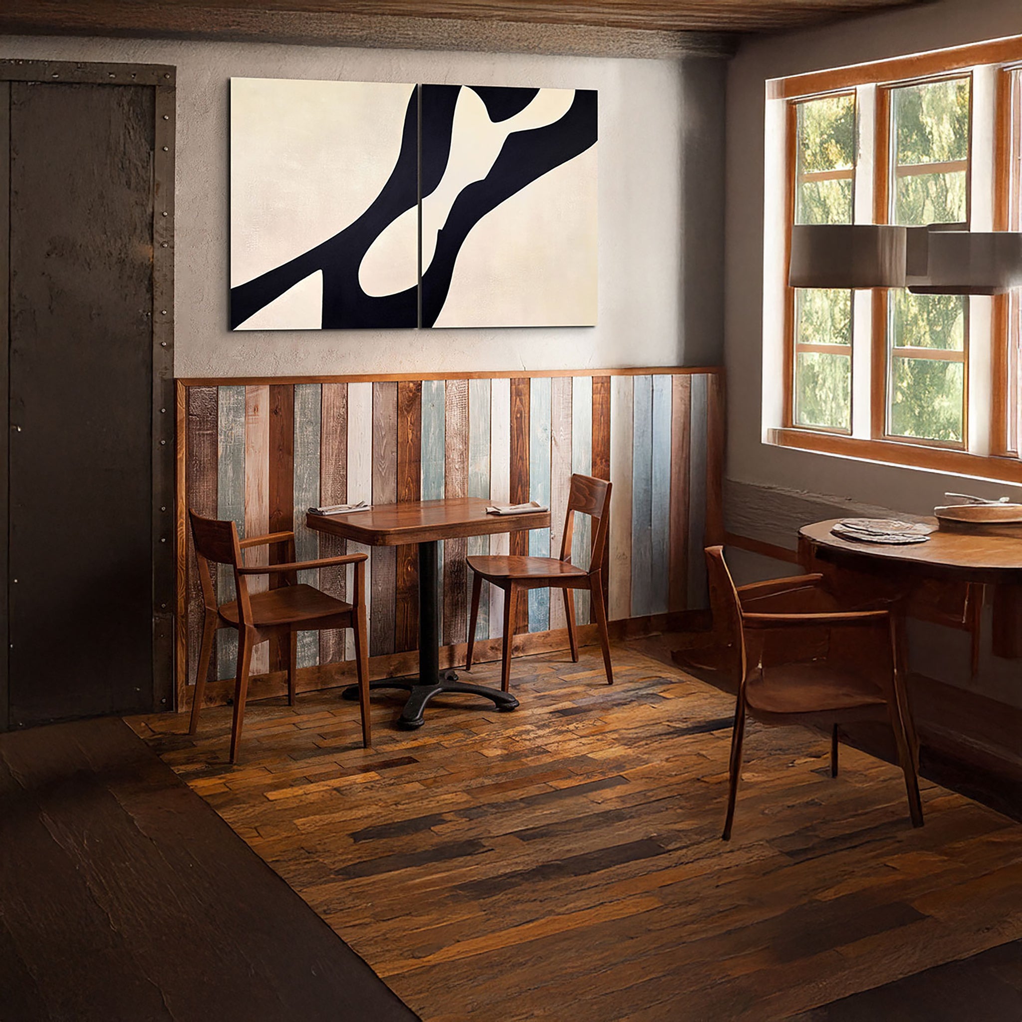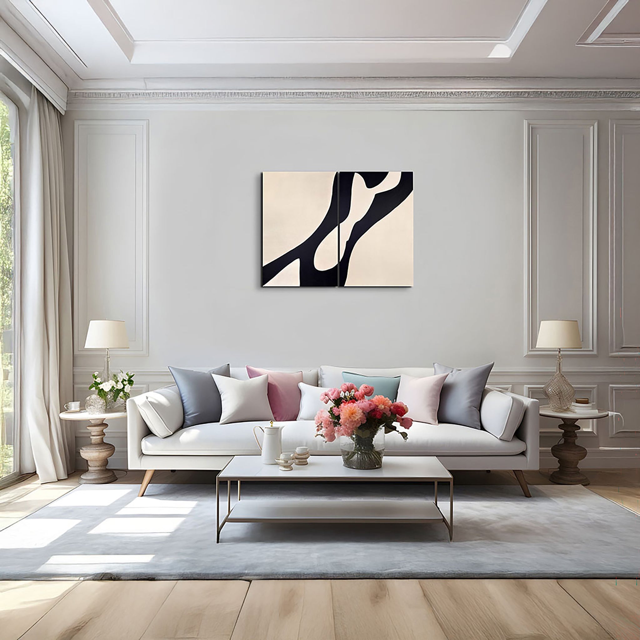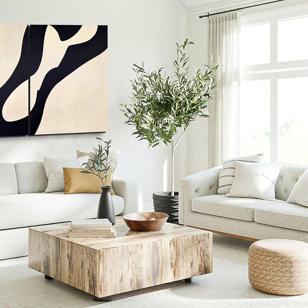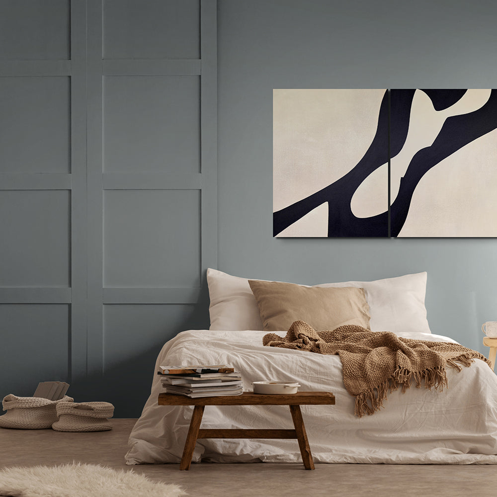 A hand-painted diptych of sweeping black forms flowing across soft light backgrounds. The two panels echo one another in movement and contrast, capturing harmony through fluid lines and balanced space.